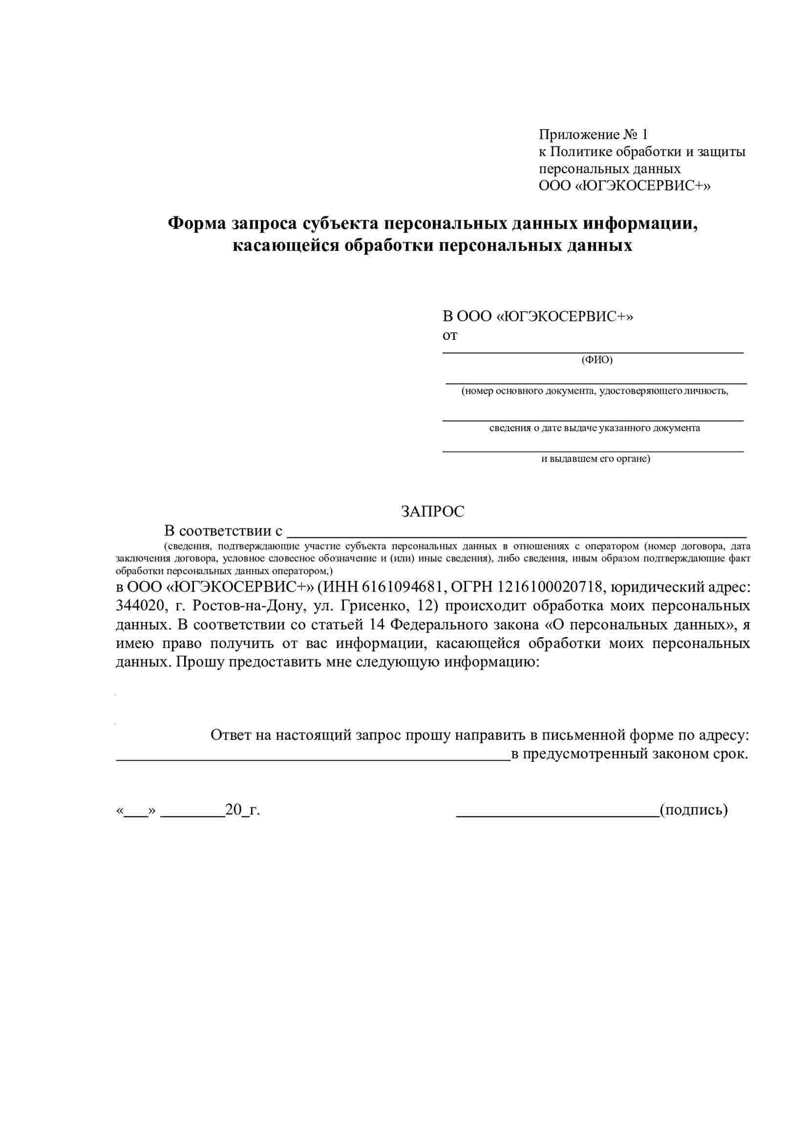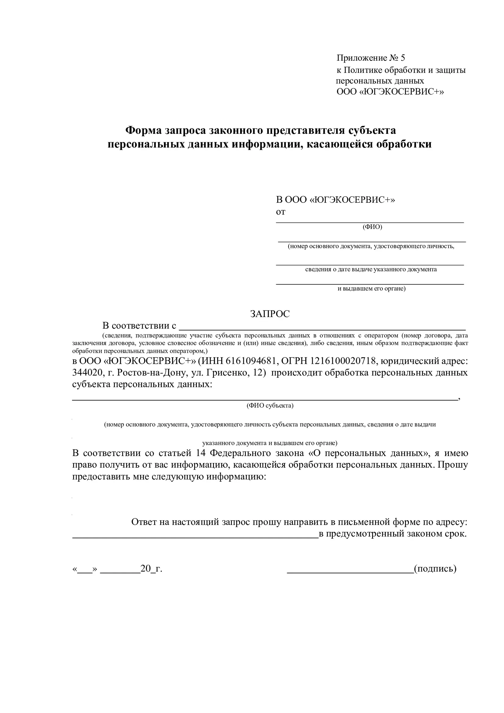 6.8. Для получения необходимой информации, касающейся обработки персональных данных, описанной в пункте 6.5.1. настоящей Политики, Субъекту (либо законному представителю) необходимо заполнить соответствующую форму запроса субъекта персональных данных информации, касающейся обработки персональных данных (приложение 1 или 5) и передать лично работникам ООО «ЮГЭКОСЕРВИС+», принимающим обращения граждан, либо по почте.