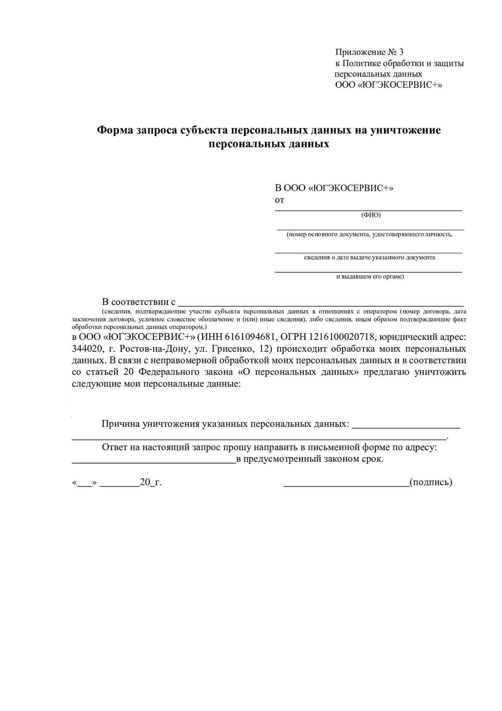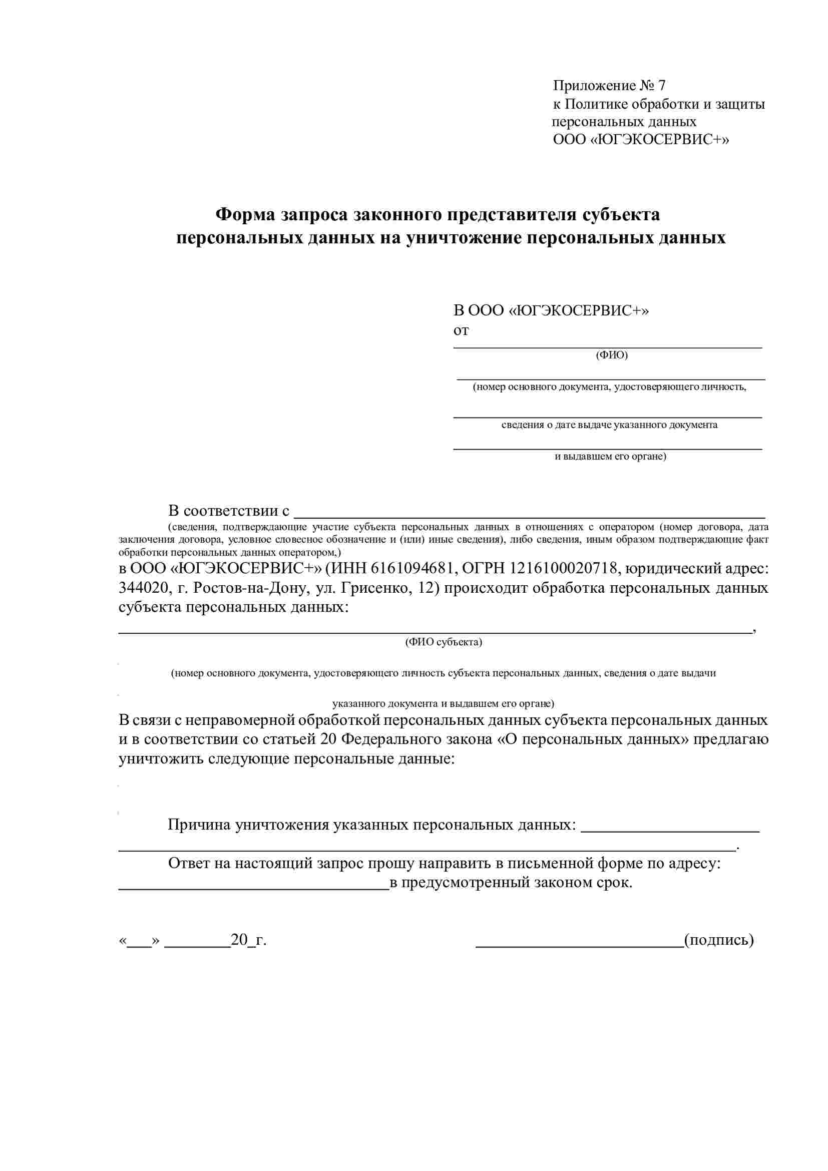 6.10. Для исключения неправомерности обработки персональных данных Субъекту (либо законному представителю) необходимо заполнить соответствующую форму запроса субъекта персональных данных на уничтожение персональных данных (приложение 3 или 7) и передать лично работникам ООО «ЮГЭКОСЕРВИС+», принимающим обращения граждан, либо по почте.