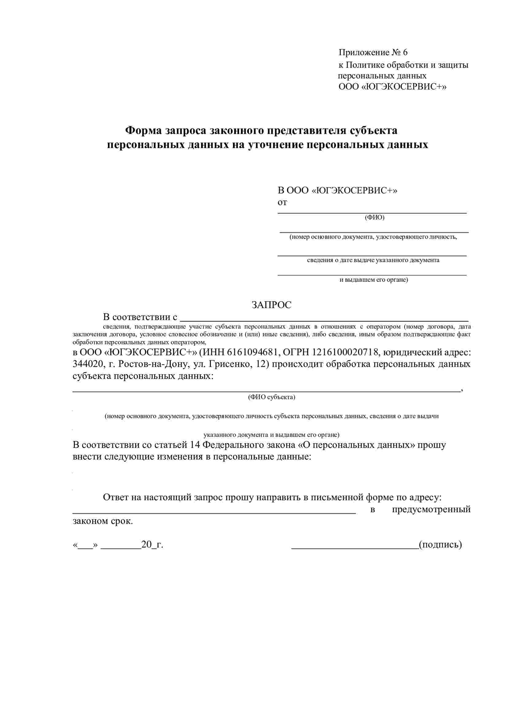 6.9. Для уточнения определенных персональных данных Субъекту (либо законному представителю) необходимо заполнить соответствующую форму запроса субъекта персональных данных на уточнение персональных данных (приложение 2 или 6) и передать лично работникам ООО «ЮГЭКОСЕРВИС+», принимающим обращения граждан, либо по почте.